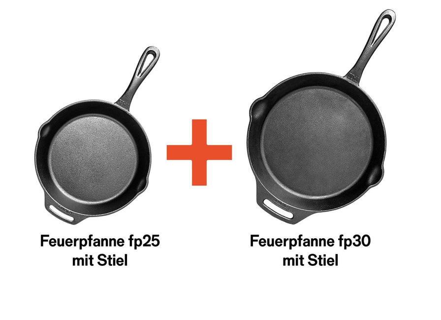 Das Set aus zwei Gusseisenpfannen (25 & 30 cm) bietet perfekte Wärmeverteilung, natürlichen Antihaft-Effekt und funktioniert auf Herd, Ofen, Grill & Lagerfeuer.