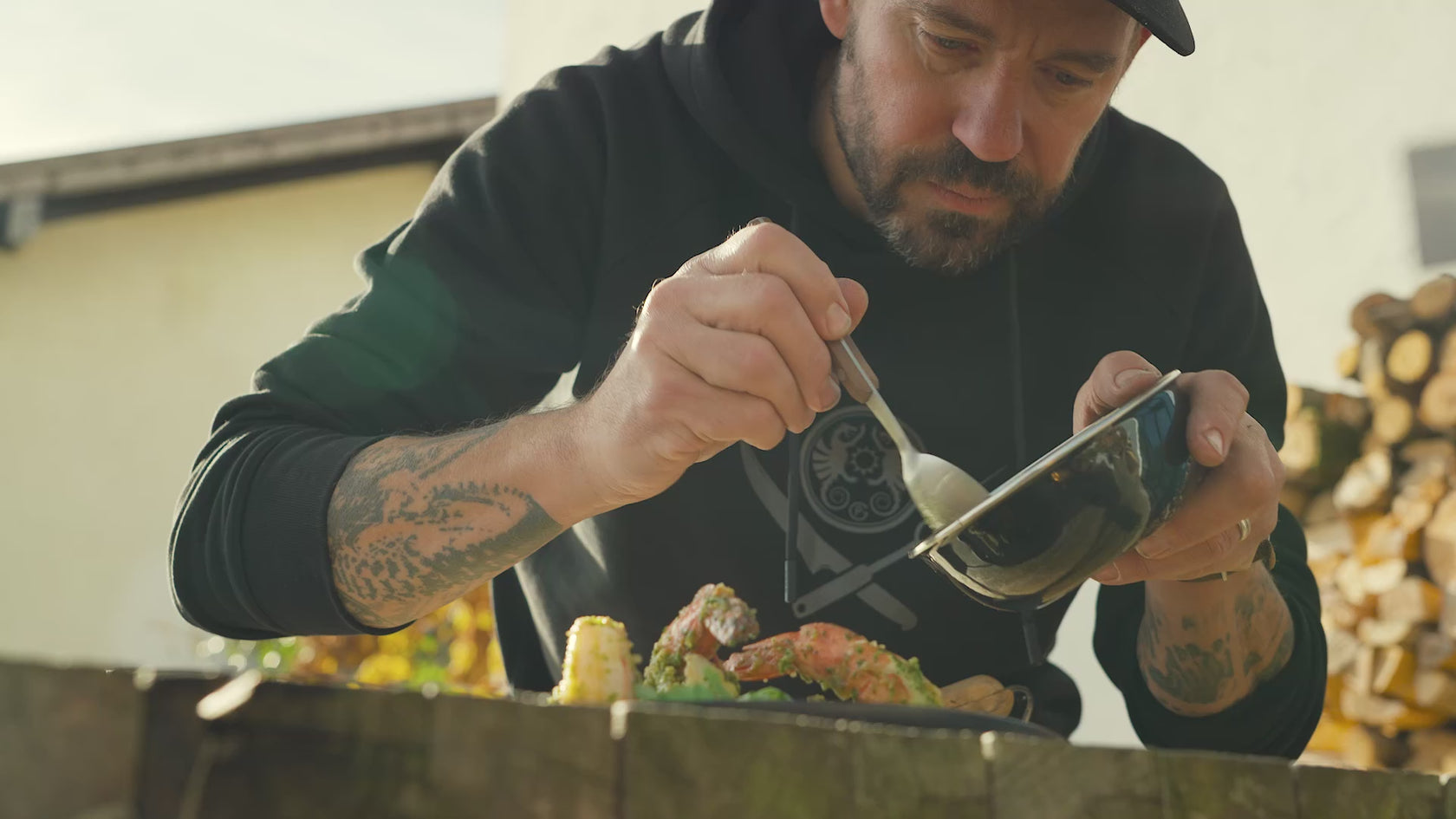 Wie immer bereitet Andi das Rezept stilecht mit den vielseitigen Geräten von Petromax zu. Der Rehrücken zieht im Glühwein, der auf der legendären Starklichtlampe HK500 erhitzt wird. Die Spekulatiusknödel gelingen mühelos im Dutch Oven, der über der Feuerschale hängt, während die karamellisierten Petersilienwurzeln im Kartoffelbräter direkt in der Glut veredelt werden.