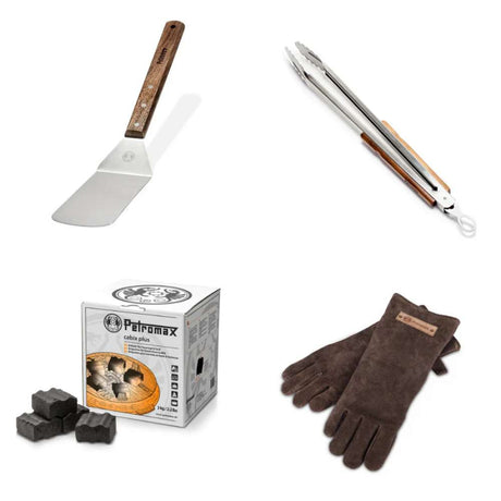 Neben den in vielen Sets bereits enthaltenen Essentials (Pflegeprodukte, Hitzeschutz) empfiehlt sich folgendes Zubehör: ein stabiles Messer und Schneidebrett, eine zuverlässige Zündquelle für das Feuer, etwas Brennmaterial, falls nicht genügend Holz vor Ort zu finden ist, umweltfreundliches Spülmittel und eine Wasserflasche zum Reinigen. Bei Dunkelheit ist eine Stirnlampe praktisch, und zur Aufbewahrung von Lebensmitteln eignen sich passive Kühlboxen.