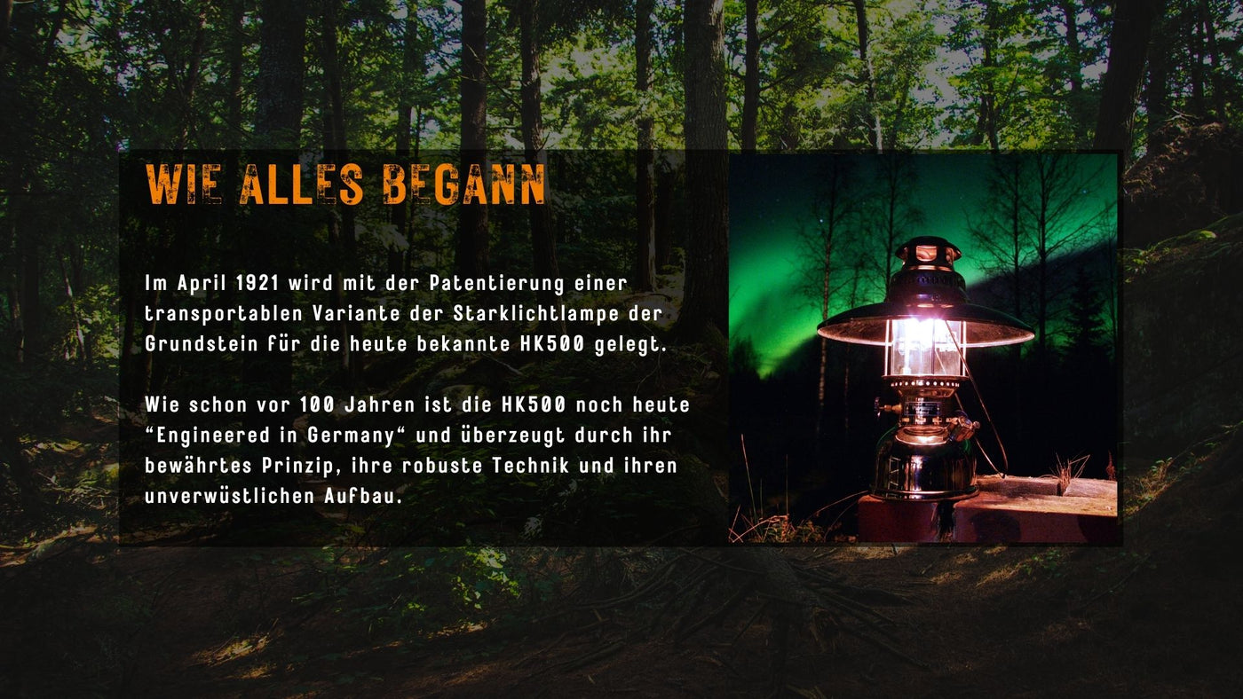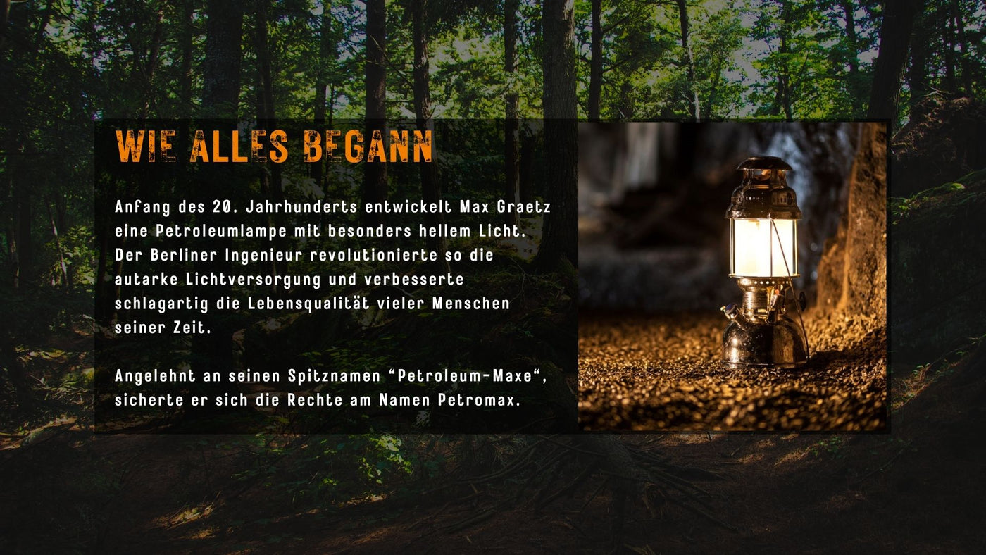 Seit 1910 steht der Name Petromax für autarke Beleuchtung, Selbstbestimmung und Unabhängigkeit unter freiem Himmel. Unsere Geschichte ist geprägt von Tradition, Innovation und Qualität. Wir sind stolz darauf, unsere Produkte als Hersteller selbst zu entwickeln und dabei höchste Ansprüche an Widerstandsfähigkeit, Langlebigkeit und Robustheit zu stellen. Unser Wissen, das sich über mehr als ein Jahrhundert hinweg bewährt hat, fließt in unsere Produkte ein und erweckt sie zu neuem Leben.