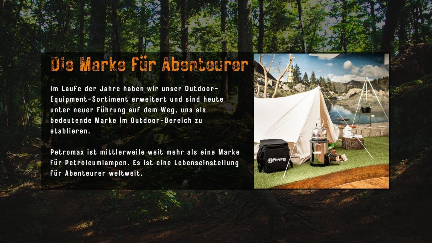Bei Petromax leben wir das Abenteuer und die Ursprünglichkeit der Wildnis. Unsere Produkte und Marke sind Ausdruck unserer eigenen Leidenschaft als Entdecker. Diese Begeisterung teilen wir mit unseren Kunden und Mitarbeitern. Wir bieten ein Umfeld, in dem unsere Mitarbeiter ihre Leidenschaft für das Outdoor-Leben voll ausleben können, inklusive großzügiger Rabatte auf unser gesamtes Sortiment.