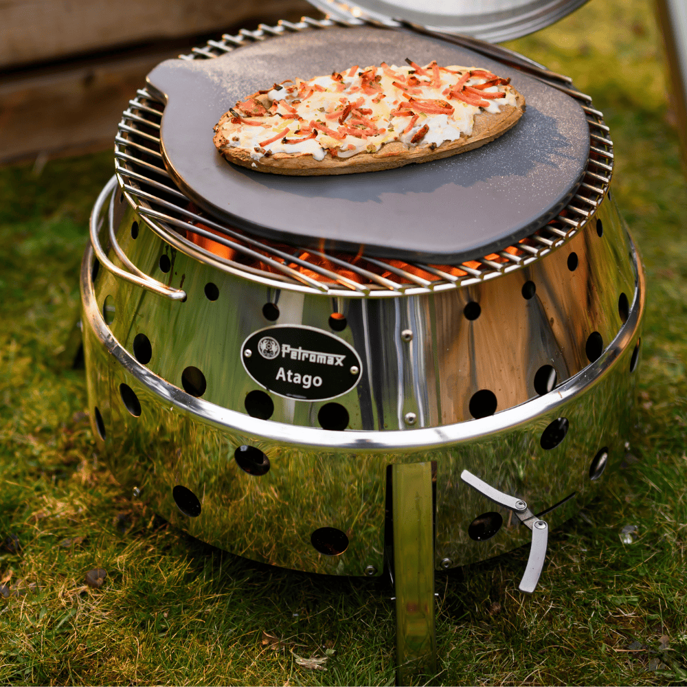 Für echtes Steinofen-Feeling sorgt der Atago Pizzastein, der Hitze optimal speichert und gleichmäßig abgibt. Seine spezielle Form ermöglicht perfekte Ober- und Unterhitze, sodass hausgemachte und tiefgekühlte Pizzen, Brote oder Desserts zuverlässig gelingen – sowohl unterwegs als auch zuhause im Backofen.