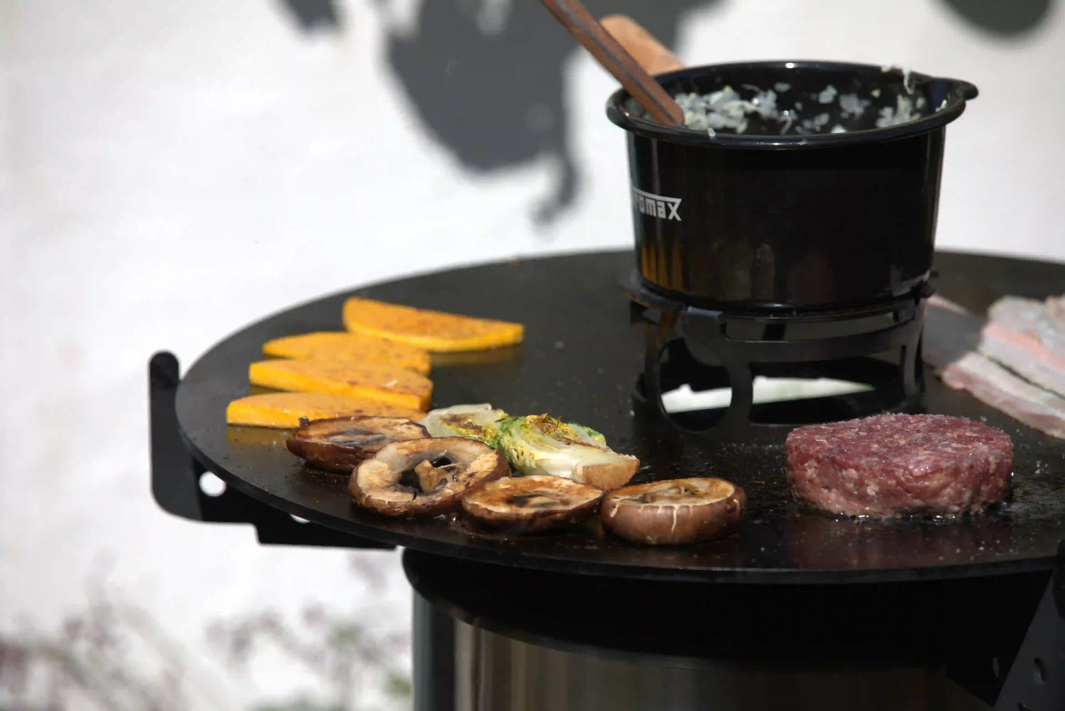 Die speziell konzipierte Grillplatte aus 6 mm starkem Stahl verwandelt die Feuertonne in einen vielseitigen Plancha-Grill und erhitzt sich in kürzester Zeit für optimale Grillergebnisse. Mit unterschiedlichen Wärmezonen bietet sie maximale Flexibilität – vom scharfen Anbraten bis zum sanften Nachgaren. Besonders für Fisch, Meeresfrüchte, Burger, Gemüse und sogar Frühstück oder Desserts schafft sie perfekte Bedingungen. Der integrierte Kochaufsatz erweitert die Grillplatte zusätzlich zu einer vollwertigen Kochstation für die Zubereitung von Beilagen, Soßen oder Marinaden.