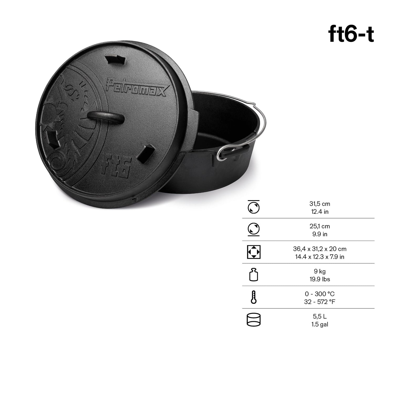 Der multifunktionale Deckel kann als eigenständige Pfanne genutzt werden und verfügt über einen hohen Rand, damit Kohle oder Briketts nicht herunterfallen. Ein stabiler Henkel erleichtert das Heben und Tragen, während der erhöhte Deckelrand ideal zum Platzieren von Glut oder Holzkohle ist. So hast du mit jedem Petromax Dutch Oven gleich zwei Kochutensilien in einem.